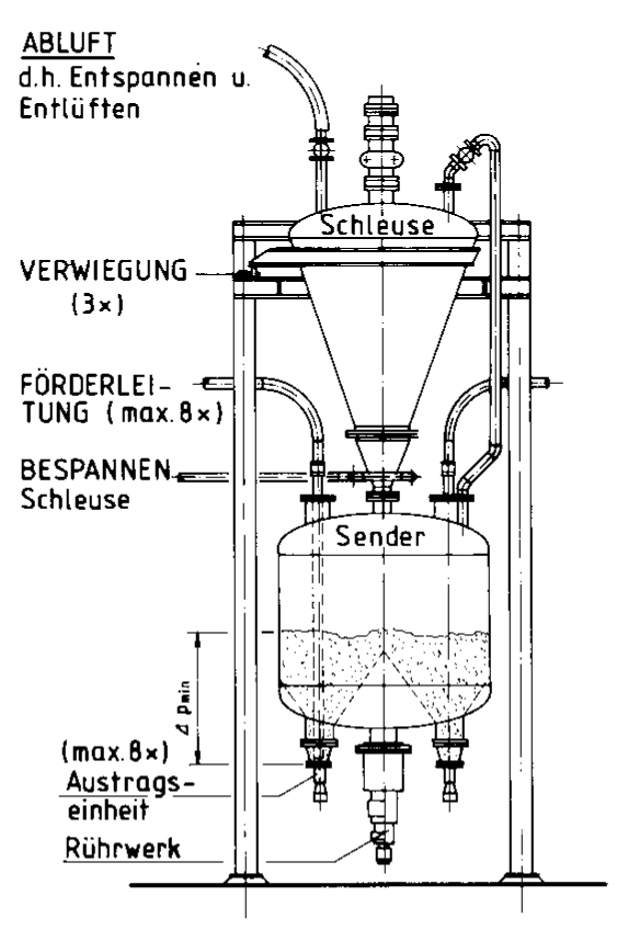 Um einen kontinuierlichen Betrieb der Anlage zu ermöglichen, wird über demSendegefäß ein sogenannter Schleusbehälter als Druckwechseleinheit angeordnet. Dieser sorgt bei Anforderungdurch die Niveauüberwachung des Dosiersenders für Materialnachschub ins Sendegefäß.