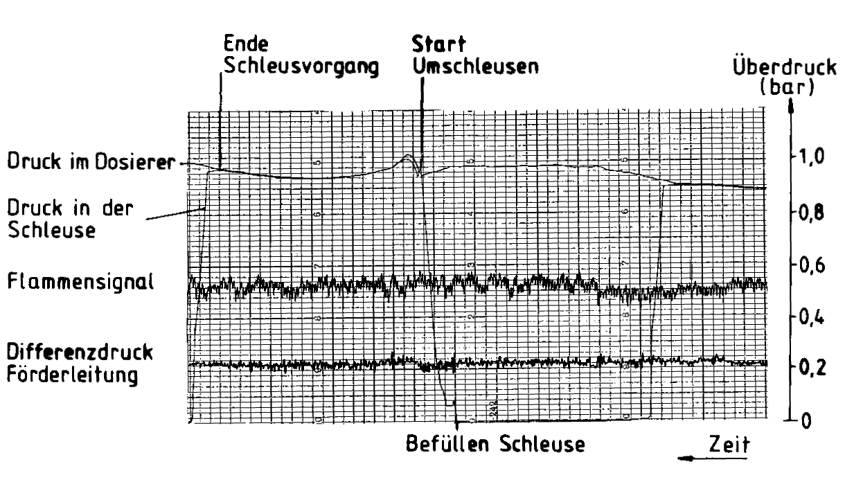 Bild 6 zeigt den schon erwähnten Druckverlauf im Dosiersystem. Neben den Behälterdrücken ist dort auch der Differenzdruck einer Förderleitung nebst zugehörigem Flammenwächtersignal aufgezeichnet. Da bei diesem Aufschrieb dieDruckstabilisierung noch nicht realisiertwar, sieht man deutlich den Einfluß der Behälterdruckschwankungen auf die Differenzdruckmessung. EntsprechendeMassenstromschwankungen (bis ca. 8 %)waren die Folge. Durch die Druckstabilisierung konnten, wie bereits unter 1.3.2.beschrieben, die Dosierfehler entscheidend verringert werden.