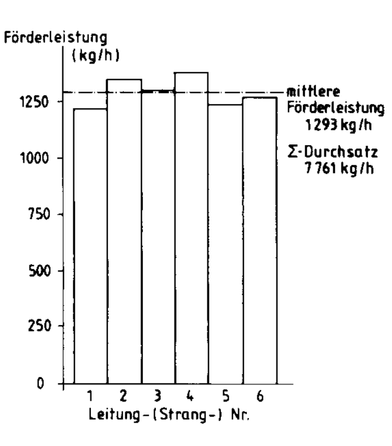 In Bild 7 sind die Förderleistungen dereinzelnen Stränge (6fach Dosiersystem)aufgetragen. Für die Einstellung der Förderleistung war die Brennerstabilität ausschlaggebend, so daß bestimmte Abwei-chungen durchaus beabsichtigt waren. Die Mindestschütthöhe im Behälter und die damit verbundene Druckdifferenz zwischen den einzelnen Austragseinheiten gestattet nämlich je nach Feststoff eine Vertrimmung von bis zu 15 % der jeweiligen Durchsatzleistungen.